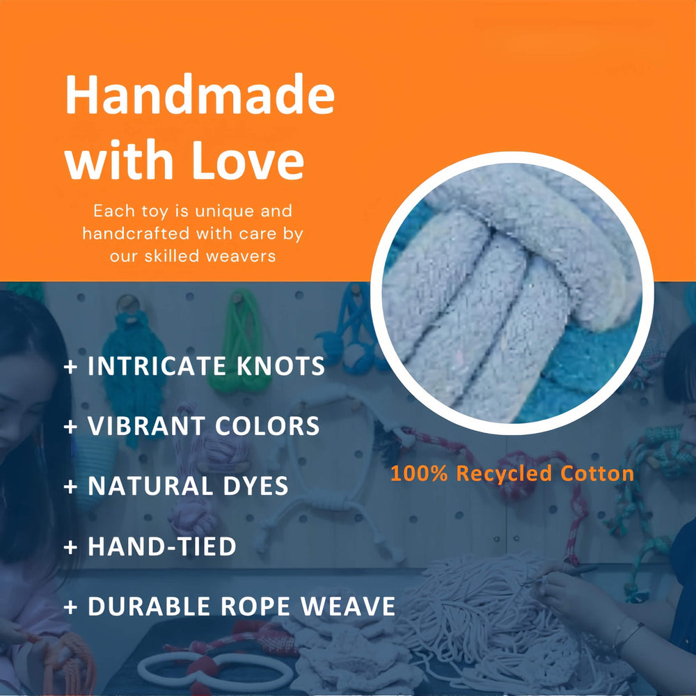 Handcrafted by skilled weavers, this rope toy is made from up-cycled, recycled cotton and colored with natural, non-toxic dyes for a safer and more sustainable play experience. The thick rope construction is densely woven for added durability, making it a great choice for dogs that enjoy tug-of-war, light chewing, and interactive games.